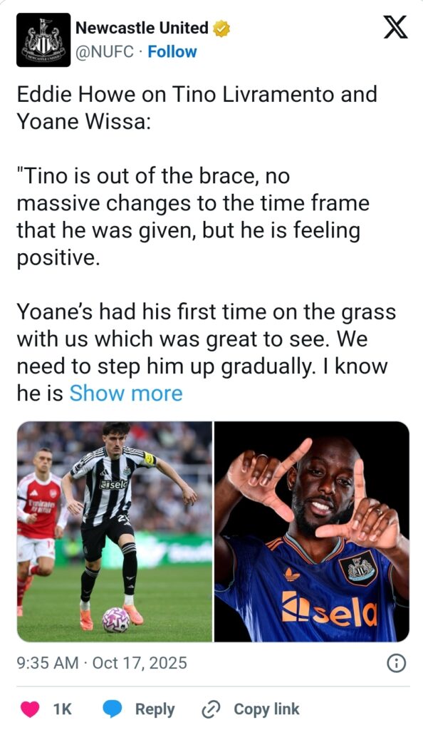 Meanwhile, Newcastle United have their own injury problems to contend with. Yoane Wissa and Tino Livramento remain sidelined due to knee injuries, with both expected to return sometime next month.