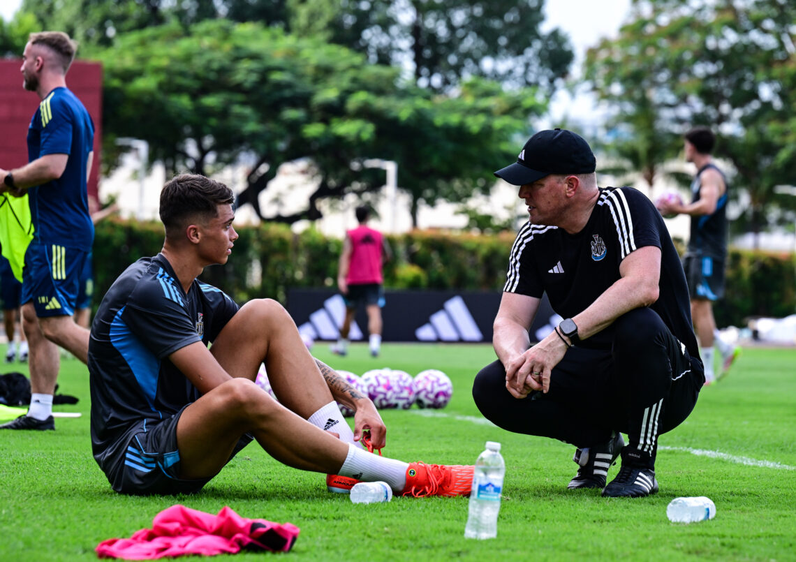 SINGAPORE, SINGAPORE - JULY 25: Newcastle United Head Coach Eddie Howe (R) speaks with Lewis Miley (L) during the Newcastle United Pre Season Training Camp at Bishan Stadium on July 25, 2025 in Singapore. (Photo by Serena Taylor/Newcastle United via Getty Images)