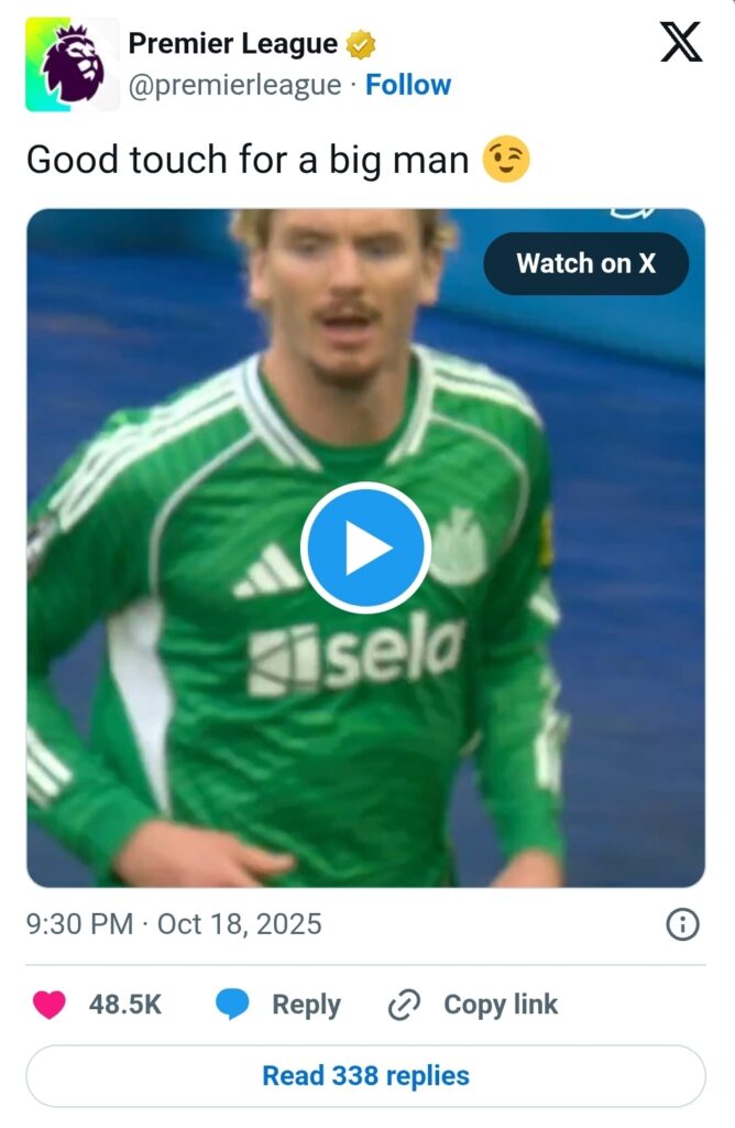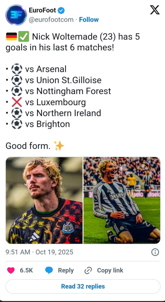 The 6-foot-6 German has been nothing short of exceptional since joining Newcastle. His goalscoring form has quickly made fans forget about Alexander Isak, who once carried the club’s goal-scoring burden.