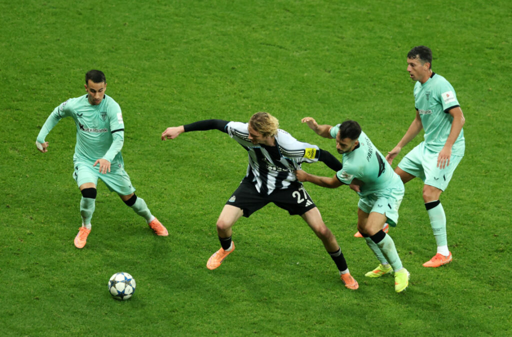 NEWCASTLE UPON TYNE, ENGLAND – NOVEMBER 05: Nick Woltemade of Newcastle United is challenged by Aitor Paredes of Athletic Club during the UEFA Champions League 2025/26 League Phase MD4 match between Newcastle United FC and Athletic Club at St James’ Park on November 05, 2025 in Newcastle upon Tyne, England. (Photo by Michael Steele/Getty Images)