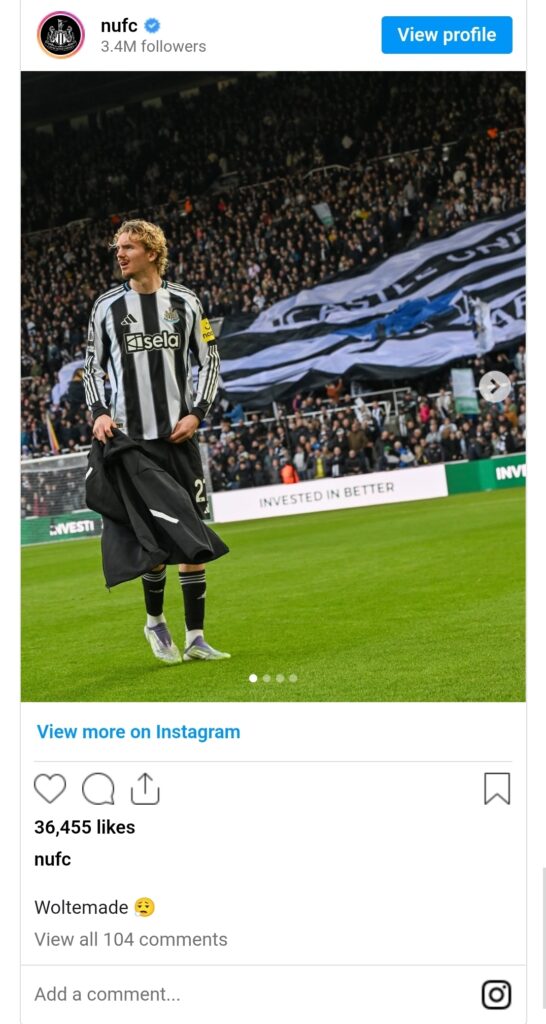 Whether intentional or not, the photo sparked laughter and pride among Magpies fans, who have fully embraced Woltemade as the club’s new cult hero. Social media was soon flooded with comments praising the media team’s wit, as fans joked that the message couldn’t have been placed any better.