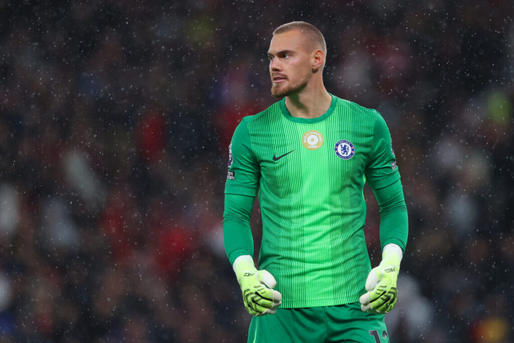 MANCHESTER, ENGLAND – SEPTEMBER 20: Filip Jorgensen of Chelsea during the Premier League match between Manchester United and Chelsea at Old Trafford on September 20, 2025 in Manchester, England. (Photo by James Gill – Danehouse/Getty Images)