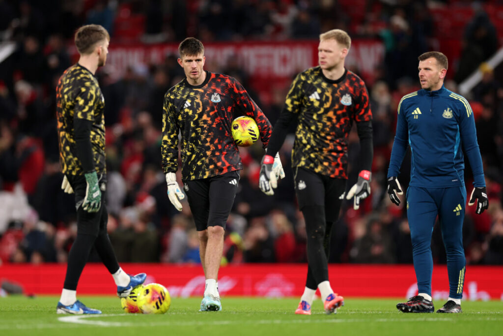 MANCHESTER, ENGLAND – DECEMBER 26: Nick Pope of Newcastle United (2nd L) looks on with teammates Mark Gillespie (L – obscured), Aaron Ramsdale (2nd R) and Head Goalkeeping Coach Adam Bartlett (R) during the warm up prior to the Premier League match between Manchester United and Newcastle United at Old Trafford on December 26, 2025 in Manchester, England. (Photo by Stu Forster/Getty Images)